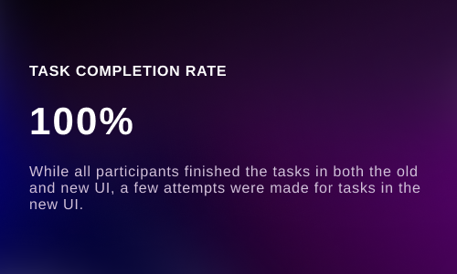 Initially, our intention was to include time-on-task measurement as a success metric. However, due to the existing users' familiarity with the current UI, making comparisons with the new UI proved impractical. As an alternative, we implemented a think aloud approach during testing.