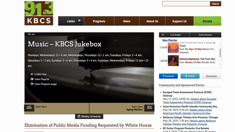 A redesigned website with simplified navigation, improved content hierarchy, and accessible design that makes listening, donating, and exploring programs easy and intuitive, while staying true to KBCS’s community-first identity.
